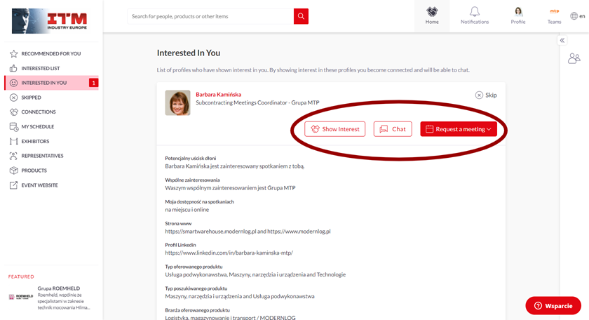 We believe that matchmaking is the best way to increase efficiency from participation in fairs. The effectiveness of participation in such meetings really depends on your activity in 2 areas, visibility on the platform and activity in booking meetings. The key is to define a specific industry, both for your offer and your purchasing plans. It encourages to contact You and makes the platform AI system suggest your profile to other participants. The best company descriptions are those that directly inform which industry and which specific product we are dealing with