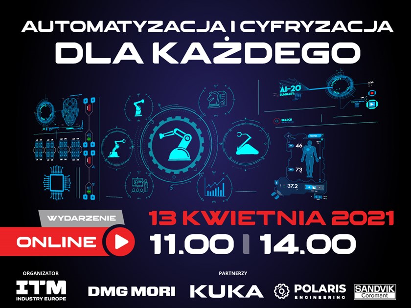 Targi ITM INDUSTRY EUROPE oraz DMG MORI, KUKA, POLARIS ENGINEERING i SANDVIK COROMANT zapraszają do udziału w jedynym takim wydarzeniu online skierowanym dla średnich i małych przedsiębiorstw produkcyjnych w Polsce. W jego ramach już 13 kwietnia 2021 r. odbędzie się wydarzenie online pt. „Automatyzacja i cyfryzacja dla każdego”, na które już teraz można się bezpłatnie zarejestrować.