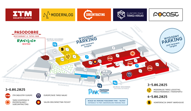 Dla uczestników ITM INDUSTRY EUROPE 2025 dostępny jest nowoczesny, trzypoziomowy parking podziemny PWK, zlokalizowany bezpośrednio przy terenie targów. To najwygodniejsze rozwiązanie dla osób przyjeżdżających samochodem – zarówno z Poznania, jak i spoza miasta.