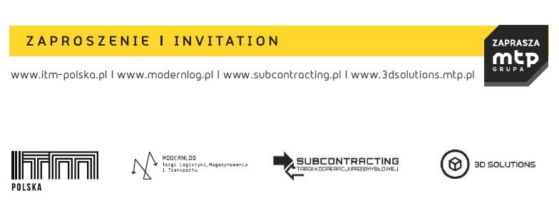 Zaproszenie upoważnia do wejścia na teren targowy, zwiedzenia ekspozycji i udziału w programie wydarzeń targów ITM POLSKA, MODERNLOG, 3D SOLUTIONS, SUBCONTRACTING i BHP w dniach 4-7.06.2019 w Poznaniu.