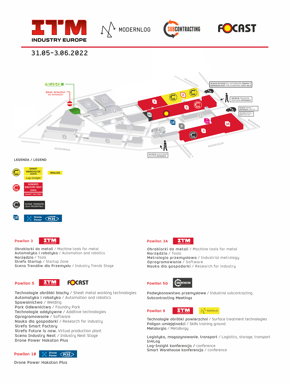 Zapoznaj się z aktualną mapką ekspozycji bloku targów ITM Industry Europe, w tym targów Modernlog, Subcontracting i Forum Odlewniczego Focast.